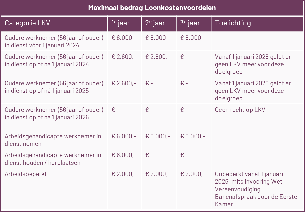 Vanaf 1 januari 2025 is de tegemoetkoming die werkgevers krijgen voor werknemers met een laag inkomen (LIV) vervallen en is de start van de afbouw van het Loonkostenvoordeel voor oudere werknemers ingegaan.